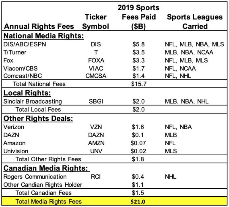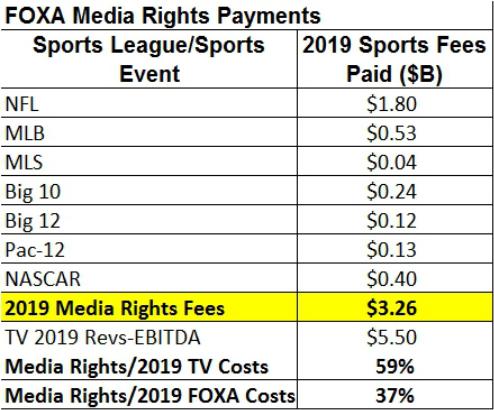 Fox每年向NFL支付18亿美元的NFC周日套餐费用,包括每年6亿美元的周四晚间橄榄球比赛转播权,该合作项目到2023年截止。Fox没有购买NBA的转播版权,MLB是继NFL之后,Fox的第二大体育赛事直播内容,它每年需要为此投入5.3亿美元。2019年,Fox为7个体育联盟支付版权费,其中支付给NFL和MLB的费用总和占到总费用的70%。