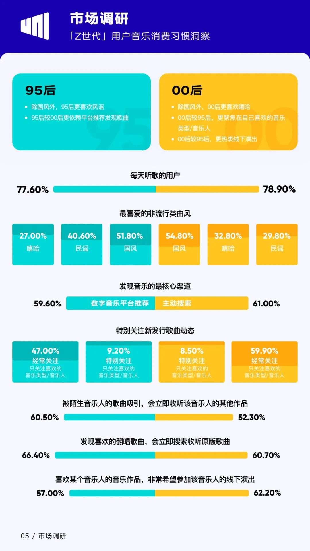 尽管同属「Z世代」用户群体,不过95后和00后,也存在不同的音乐消费习惯。音乐喜好上,除国风外,95后更喜欢民谣,00后则更喜欢嘻哈;发现音乐方面,95后较00后更依赖平台推荐发现歌曲,00后则更聚焦在自己喜欢的音乐类型/音乐人。此外,00后较95后更热衷线下演出。