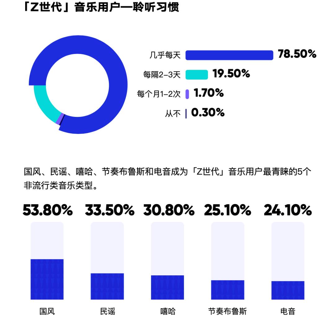 聆听习惯:「Z世代」音乐用户的听歌频率极高,近80%的受访用户表示自己每天都听歌。其中,国风、民谣、嘻哈、节奏布鲁斯和电音成为「Z世代」音乐用户最青睐的5个非流行类音乐类型。