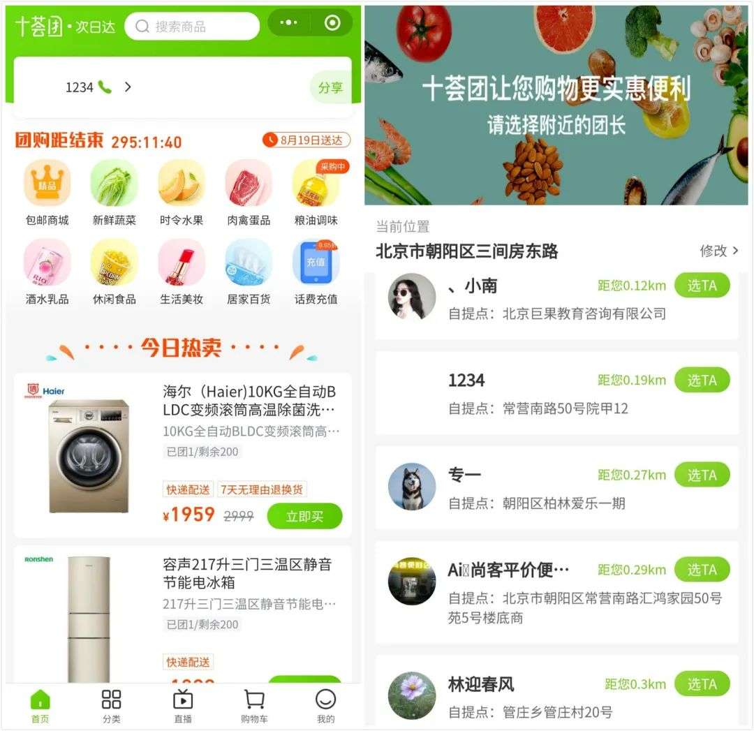 在「十荟团」小程序中可以自由选择附近的团长(自提点),从图中可以看出「团长」角色的多样