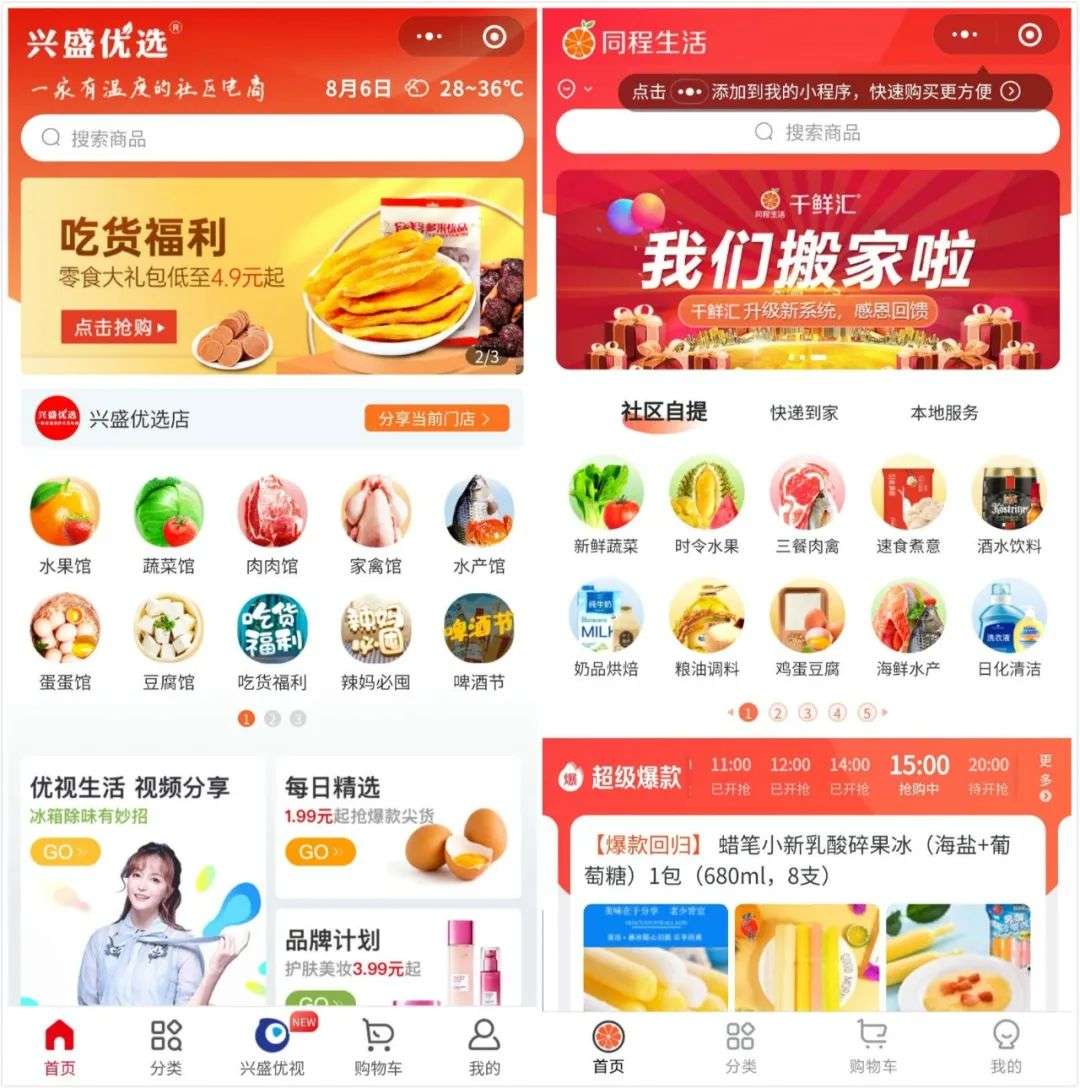 「兴盛优选」、「同程生活」的小程序界面