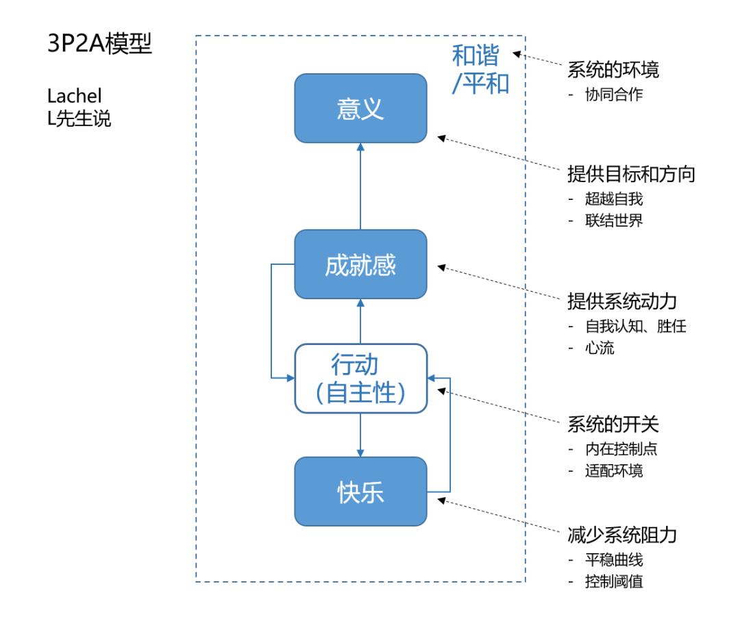 在第三点中,我们提到这个模型的基本结构:意义提供目标,快乐减少阻力,成就感提供动力。这是 3P2A 模型的核心引擎。
