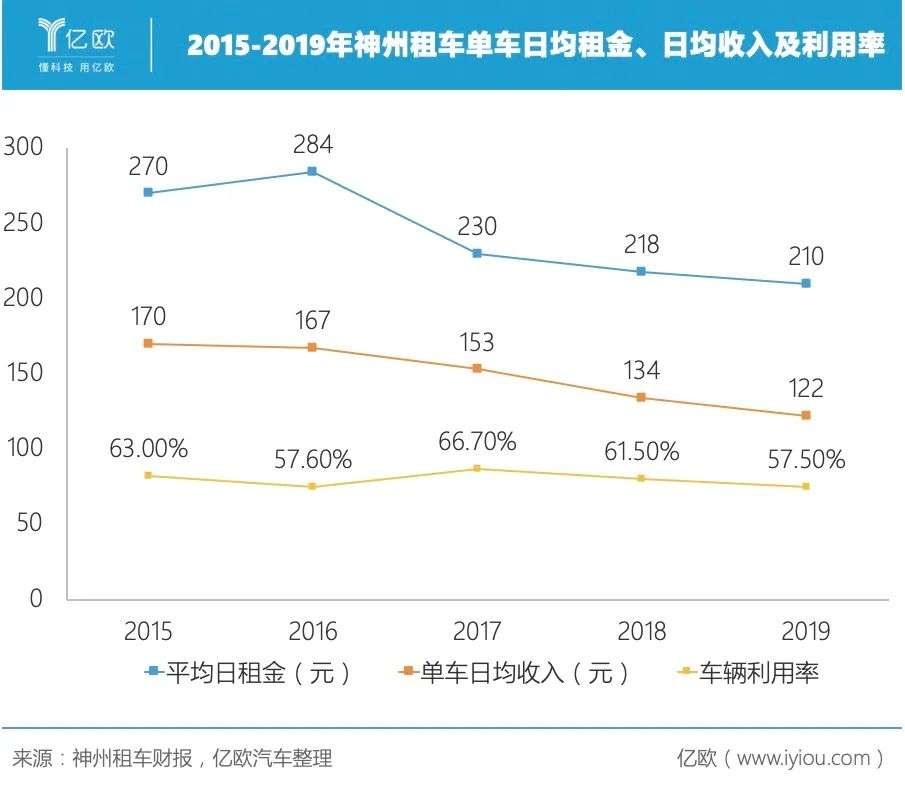 神州租车平均日租金从2016年最高的284元降至2019年的210元,跌幅达26%;单车日均收入从2015年最高的170元降到2019年的122元,跌幅达28%以上;2017年后,其车辆利用率也在逐渐下降。