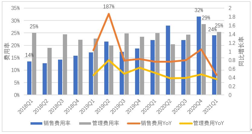 销售费用率从2018年Q1的14%一路上扬,到2021年Q1的24%,除了本财年一季度外,同比增速始终保持在75%以上,远高于营业收入增速。