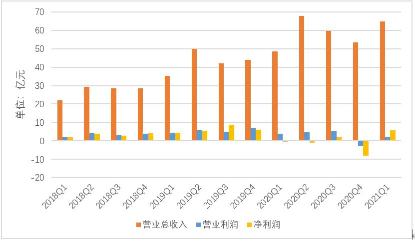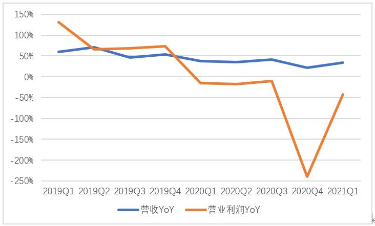 首先,尽管9.107亿美元的营业收入实现了同比35.2%的高速增长,但好未来的营业利润从2020年一季度开始同比持续下跌。