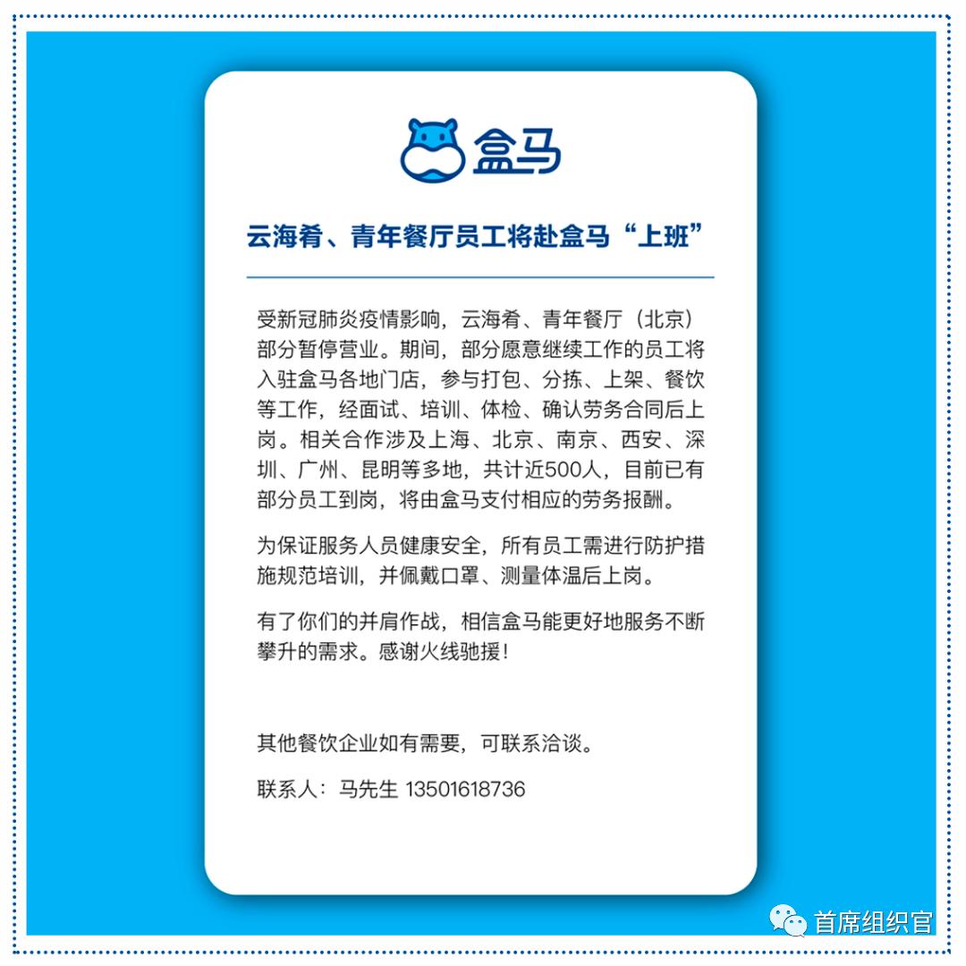 疫情期间,一些企业推出了“共享用工”计划,比如阿里旗下的盒马鲜生。2020年2月3日,盒马鲜生发出了一封面向其它企业的“招工令”,邀请云海肴、青年餐厅等公司的员工“临时”到盒马上班。盒马鲜生通过这种方式,接纳了超过5000名“共享员工”,实现了盒马鲜生、其它企业和员工的三方共赢。