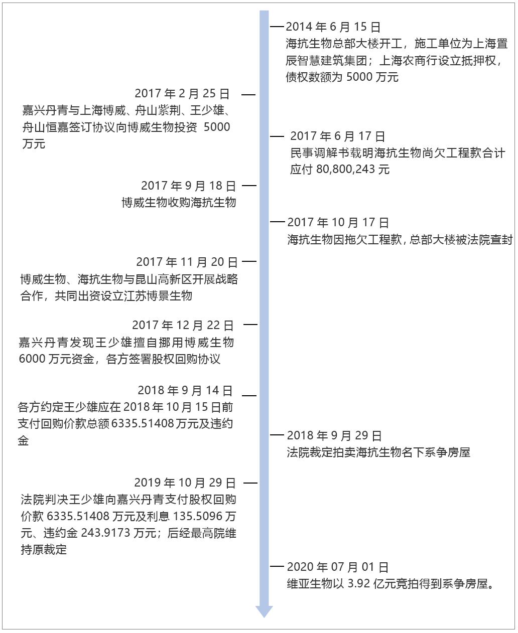 根据编号(2019)最高法民辖终509号的最高院终审裁定书、编号(2019)沪0115执异234号的上海浦东新区人民法院执行裁定书,以及公司工商登记信息,综合海抗生物官网,大致可以得到如下时间脉络: