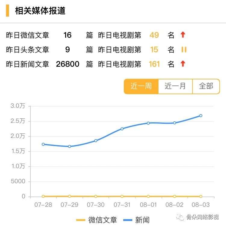 骨朵截取近一周的微信文章和新闻报道数,微信文章数、头条文章数排名均有上升,新闻报道数在8月3日已突破2.5万并持续上升。