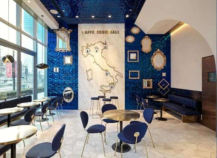 门店设计以蓝、白、金为主色调,搭配大理石、黄铜、威尼斯玻璃等装饰,营造意大利风情体验。店内分为咖啡饮品区、咖啡设计区和餐食甜品区三个区域。相较于该品牌在米兰开设的旗舰店,上海旗舰店则偏重于意式生活方式的传达,以及满足人们多元化需求为主。