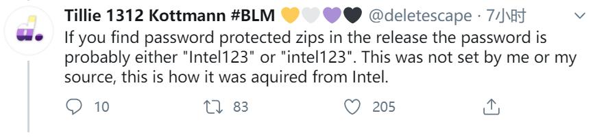 Tillie Kottmann 在推特上补充称,如果你在泄露的文件中发现有密码保护的压缩包,那密码可能是 “Intel123” 或 “intel123”。这不是我或给我透露消息的人设置的,这是英特尔自己设置的。