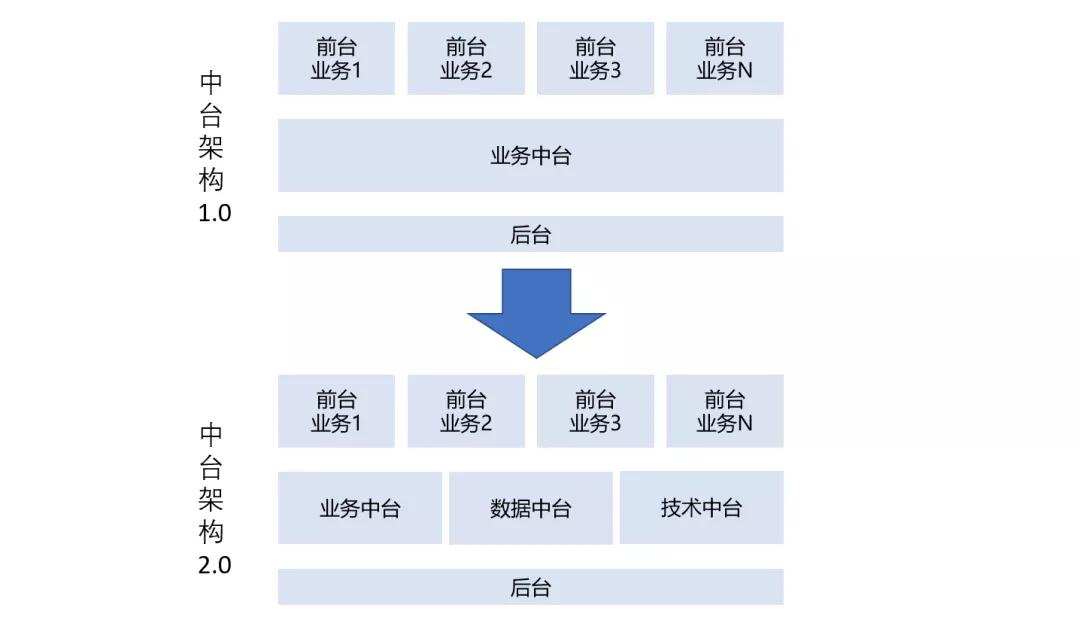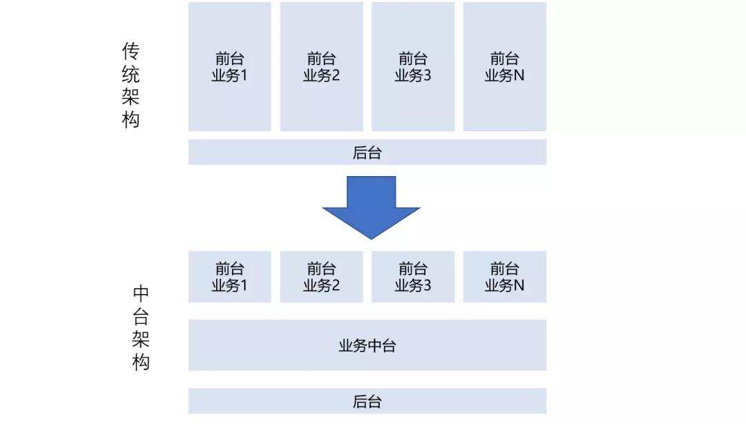 原本企业的传统架构只有“前台”和“后台”,后台负责企业的运营管理和资源支撑,如产品系统、客户管理系统、财务系统以及技术基础设施等。而面向前台的则是具体的业务部门。如果某些业务部门收益高、规模大,就有可能获得绝大多数后台资源的支撑,甚至自己组建单独的后台部门,一旦其他业务部门效仿,最终的结果就是业务部门重复建设,业务之间无法配合,业务数据无法打通等问题出现。