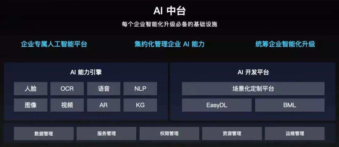比如,百度智能云,提出的AI中台就包含了AI能力引擎和AI开放平台,前者集中了人脸识别、OCR、语音识别、NLP、图像识别、知识图谱、深度学习等多项AI能力;后者还包含场景化定制开发平台的EasyDL和BML。百度正是以AI中台的通用能力,为自身的业务和客户提供AI技术的支撑和协调。