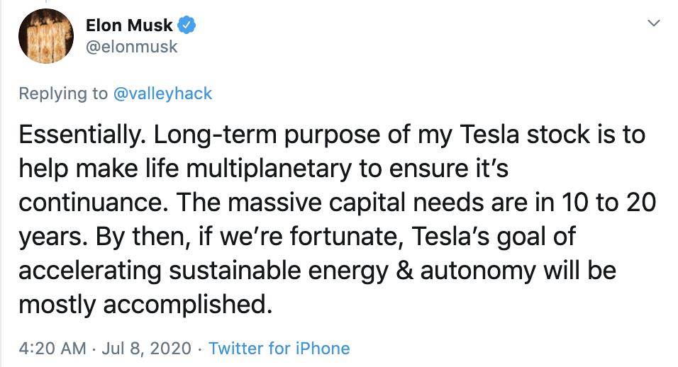 基本上,我长期持有特斯拉股票的目的,是帮助人类征服(火星这样的)行星,以使生命延续。这在10年到20年之内会需要大量的资本投入。
