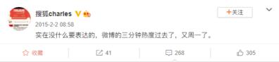 硬挺了数年之后,搜狐微博宣告最终失败的标志或许是张朝阳在2015年注册新浪微博。入驻新浪微博几天后,张朝阳发了一句话:“实在没什么要表达的,微博的三分钟热度过去了,又周一了。”