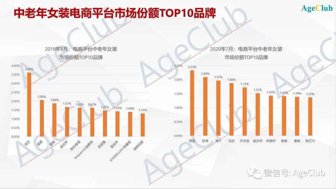 AgeClub一直密切监测主流电商平台中老年消费品的最新市场变化,通过数据分析和专家调研发现,主流电商平台上有一大批专门做中老年女装的玩家,但市场份额多年来一直很分散,而且很少有长期稳定占据前列的品牌。