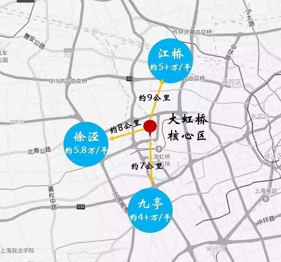 除此之外,九亭这里一直以来都认为是上海的刚需聚集地,南至松江大学城、西至青浦新城、北至嘉定新城都要4万+了,而九亭与这些板块相比,距离大虹桥、距离外环更近。