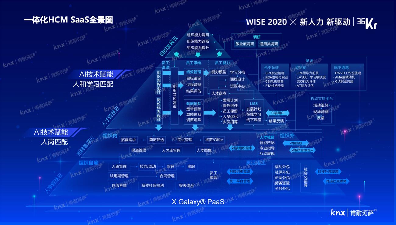这个过程是非常复杂的体系,通过组织能力杨三角理论来进行分解,企业组织能力的提升落到员工治理、员工思维、员工能力三个维度。在肯耐珂萨的HCM SaaS全景体系中,人事管理云、招聘管理云、人才管理云、组织发展云,每个模块之间都有连接逻辑,数据也能得以互相串联。很多人聚焦在谈一楼,人事管理云的层面,今天也想和大家分享另一个维度,三楼的人才管理云,我们认为企业提升组织效能,整个第三层是关键。