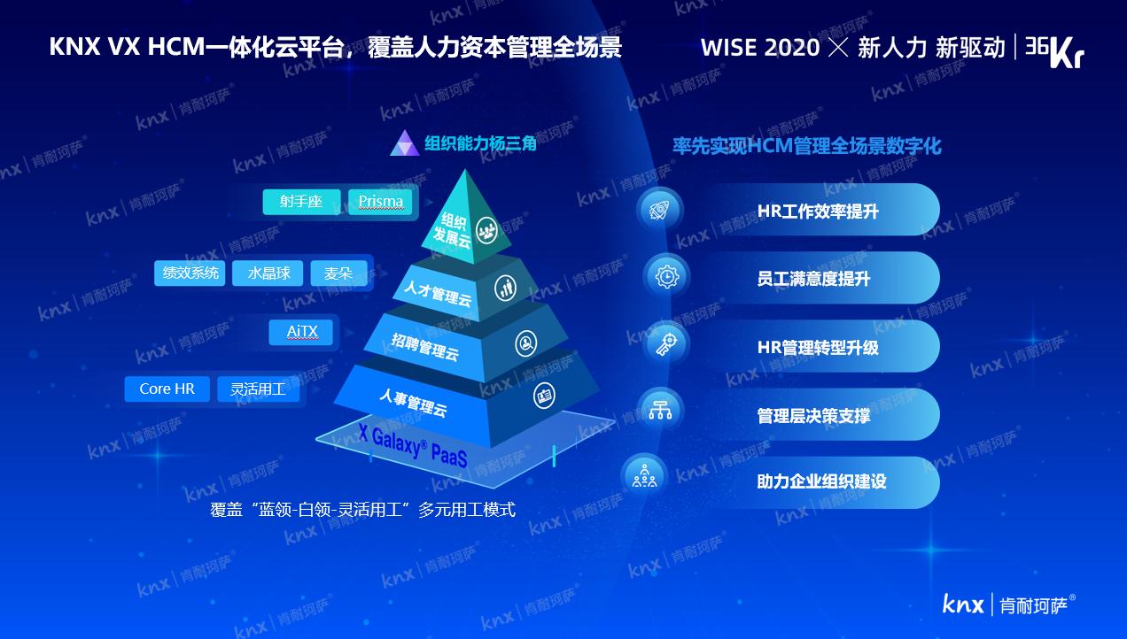 前面讲到了四层楼,肯耐珂萨的四层“金字塔”产品体系中包含的产品,大家也都比较熟悉,灵活用工、绩效管理、人才发展、组织发展等等,包括此次疫情期间非常蓬勃发展的线上学习平台,我们会进一步做学习的精细匹配,对人、岗位进行适合的学习内容推荐。肯耐珂萨整个HCM四层产品体系,已经率先实现了HCM管理全场景数字化,帮助HR、员工、管理者、组织进行各方面的效能提升,经过数据测算,根据不同企业的不同发展周期,提升率有所差异。