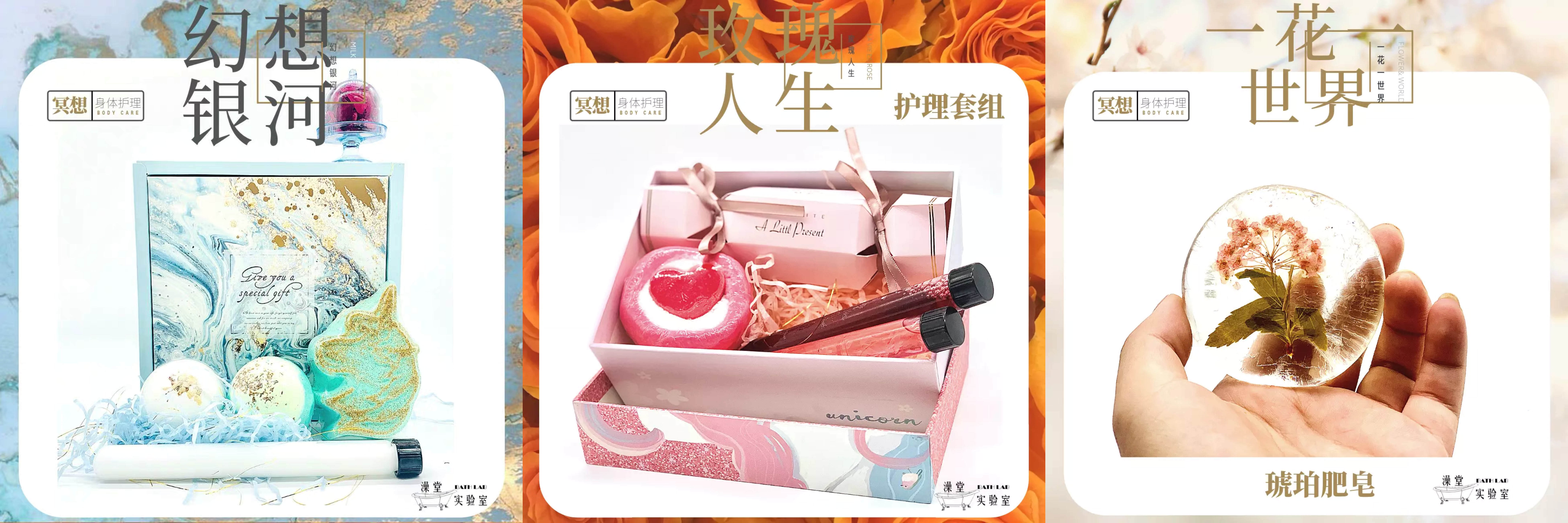 Bath Lab目前有魔法甜品、幻想银河、玫瑰人生等8个系列泡澡球,12款原创冥想课程。泡澡球采用实验室器皿的包装,单品售卖有大小两种规格,定价分别在29元和39元,手工皂定价39元,套盒会搭配有多款泡澡球、香氛产品和冥想课程,定价在百元左右。