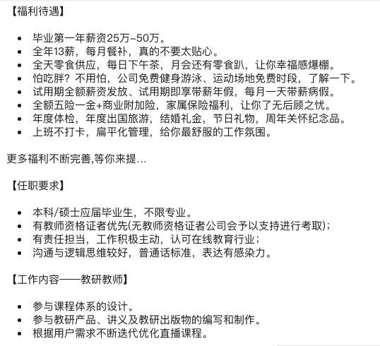 而哪怕是在行业头部名企的招聘JD中,也大都不限专业、不强制要求持有教师资格证、本科硕士皆可申请。