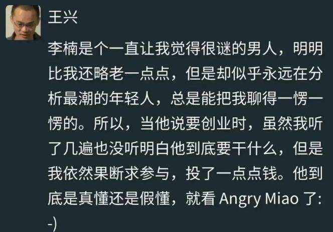 至于李楠创业做“怒喵”要怎么干,王兴也说自己“听了几遍也没听明白”,但确定的是,李楠明明比自己还“略老一点点”,“却似乎永远在分析年轻人”。对此,李楠将王兴这番话理解为:“说了天使轮的实话”。并且他援引了雷军当初的例子,认为早期的故事并不能说得太清楚,否则胜率不高。