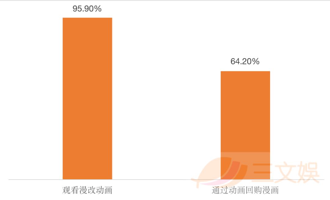当问到,“是否会选择观看漫画改编的动画作品时”,95.9%的人表示会。而且反过来,64.2%的用户表示动画改编是否成功,也会影响到是否会选择回购漫画书。也就是说,成功的改编会为动画、漫画带来双赢的效果。
