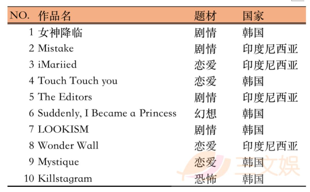 在印尼受欢迎的漫画题材为剧情、恋爱。以2020年7月份为基准,在印尼销量前10的漫画作品中,有4部剧情题材的漫画、4部恋爱题材的漫画,而且有6部作品都是韩国的漫画,而剩下的4部是印尼本土的漫画作品。