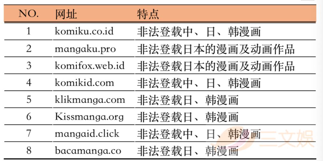 根据韩国文化产业振兴院在2017年的调查发现,一些盗版漫画网站(mangashiro.net,mangakid.net,komikgo.net)被归类为侵权网站而被关停,在2016年运营的一些网站(komikgo.com,mangavy.con,mangadropout.con)的URL也已经无法获得正常的连接。