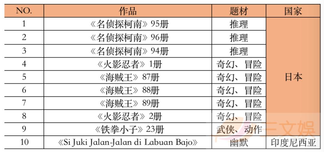 虽然电子漫画市场的规模在逐年增加,但截止到现在,纸质漫画依旧是拥有着庞大的市场。而在纸质漫画市场中,日本漫画以几乎垄断式的地位占据着整个市场的份额。据印尼的漫画出版公司Elex Media的调查发现,销量前十的漫画作品中,9部作品就来自日本,其中《名侦探柯南》和《海贼王》还分别上榜了三部作品。
