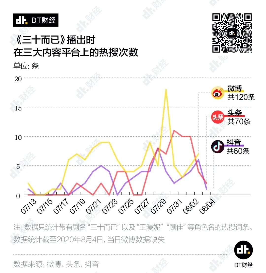 从2020年7月13日到8月3日,微博上一共出现了120条带有“顾佳”“王漫妮”等主角名称,以及剧名 “三十而已”的热搜。