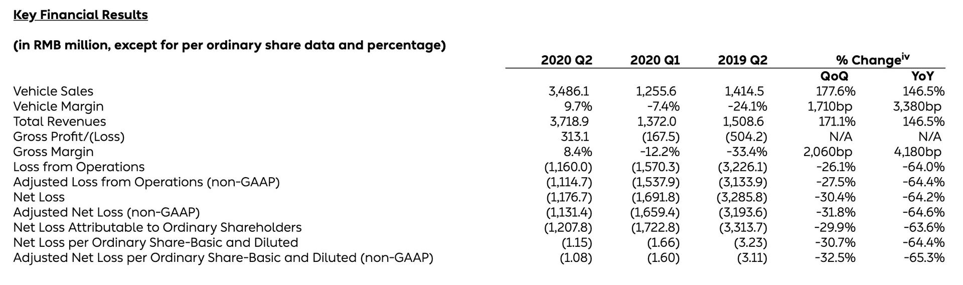 此外,2020年二季度蔚来经营亏损也为历史最低,同比减少64%至11.60亿元人民币(1.642亿美元)。归属于蔚来汽车普通股股东的净亏损为12.07亿元(1.710亿美元),同比减少63.6%,环比减少29.9%。股权激励费用和可赎回非控制性权益的赎回价值增值,蔚来普通股股东应占调整后净亏损(non-GAAP)为11.310亿元(1.601亿美元)。