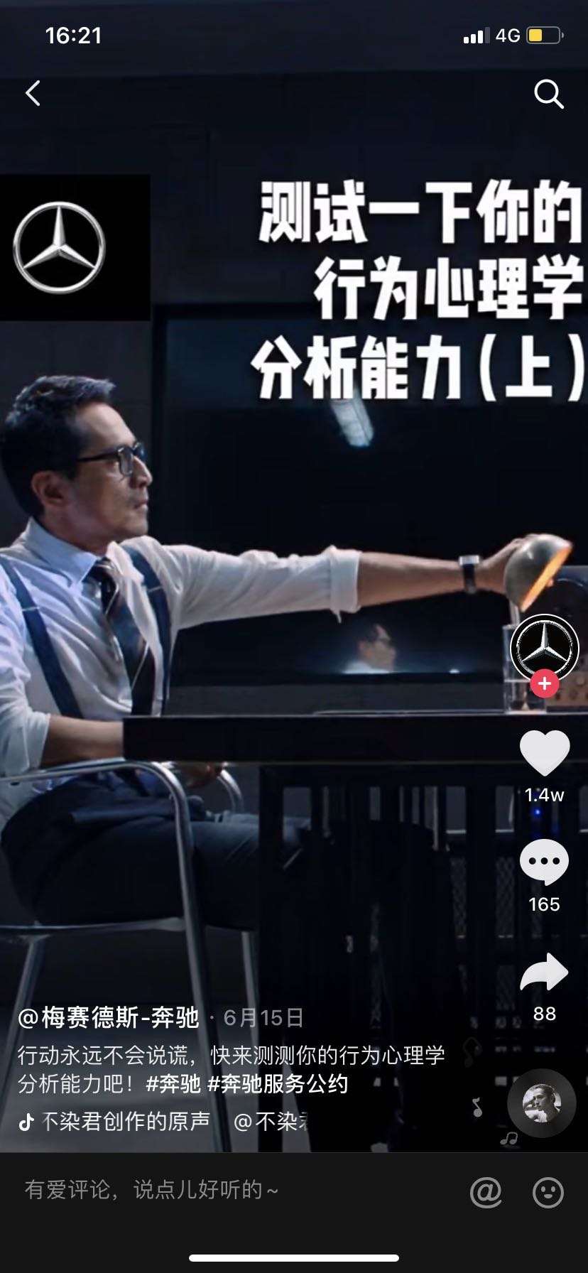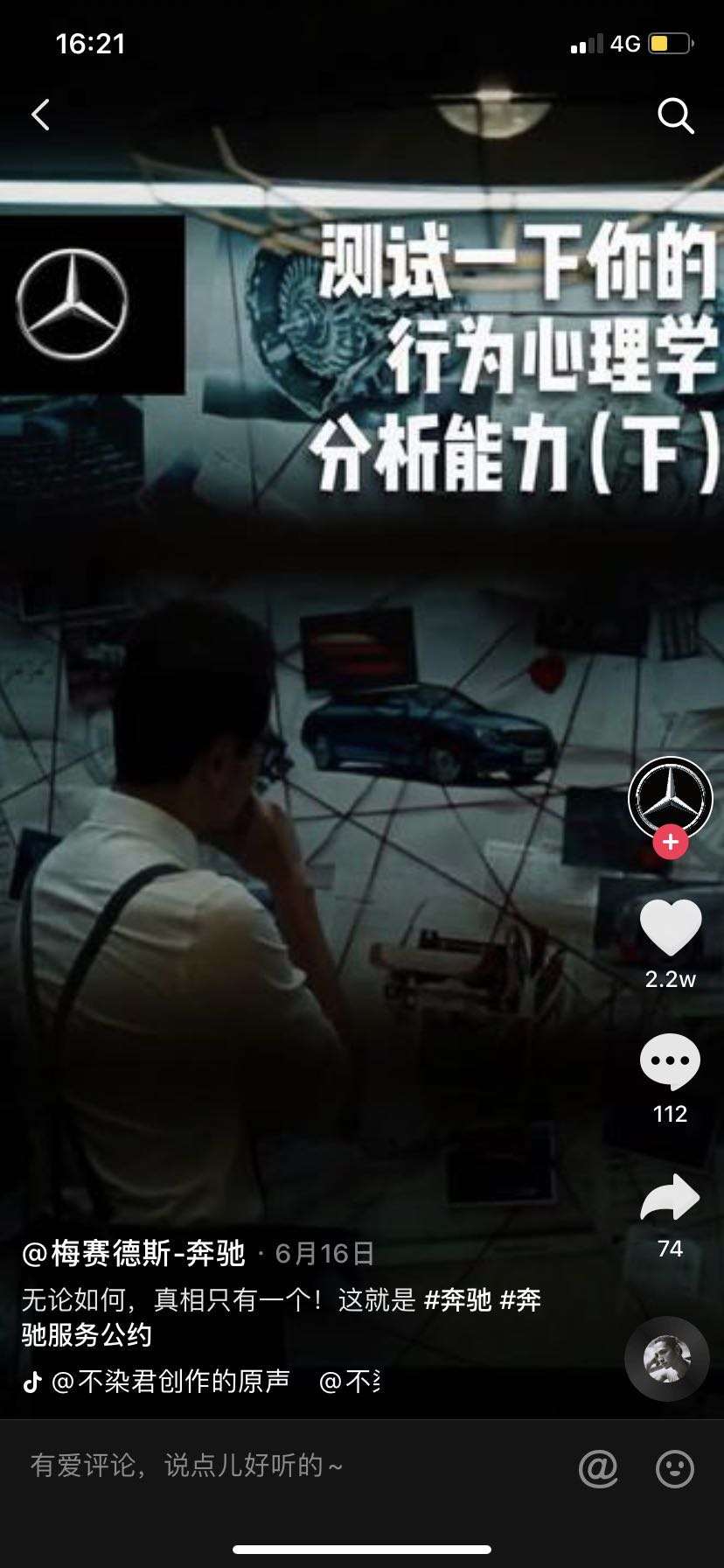 以奔驰《服务公约》抖音视频来举例,奔驰将去年在社交媒体投放的《服务公约》系列病毒视频再次改编,结合了抖音热门音乐,使用了心理学测试的方式,让本来就具备社交传播能力的病毒视频,更加贴合抖音生态,产生了更好的互动效果。用更柔软的方式,潜移默化地进入消费者的心智。