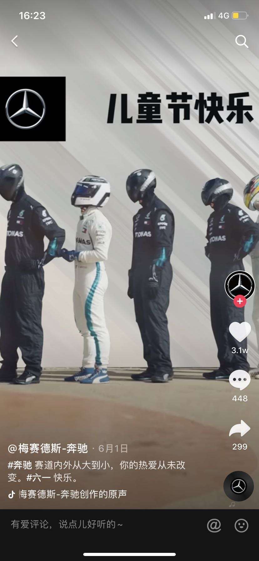 奔驰的第一个策略,就是重新认识抖音生态,不一味地迎合抖音热潮,而是用奔驰的格调,表达大家在关注的生活态度。以奔驰抖音六一儿童节视频为例,视频用驰骋赛场的AMG赛车手的画面开场,体现奔驰强能力者人设,结尾却反打赛车手们出了赛场也是要排队等着玩玩具的大男孩,用这种令人会心一笑的方式庆祝六一儿童节。更加体现品牌精神和格调,用令人会心一笑的高级幽默感跟随抖音热点。