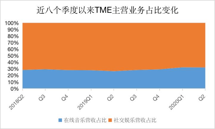 腾讯音乐主营业务收入主要由在线音乐与社交娱乐两大业务构成,其中在线音乐营收占比长期在30%上下波动,一度被人认为是打着音乐的名义搞直播。