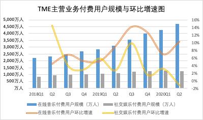 只过了三年,两大业务在财务数据上的反映迥然不同。一方面是在线音乐业务与社交娱乐付费用户规模只到千万级,且高ARPU的社交娱乐业务陷入增长瓶颈,在线音乐业务环比增速没能出现爆点。