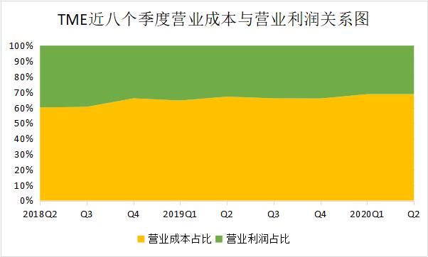 首先,腾讯音乐经过几年高增长后,随着增速有所趋缓,自2018年第四季度开始成本增速显著高于营收,连续多个季度维持高位,使得成本在营收中的占比逐渐从2018年Q4的60.1%抬升到68.7%,并长期维持在60%以上。