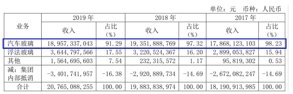 年报数据显示,2019年,福耀玻璃实现营业收入211.04亿元,同比增长4.4%;其中,主营业务汽车玻璃销售收入为189.57亿元,同比下滑2%。