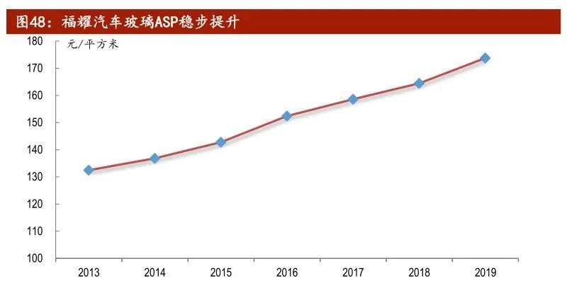 如果从更长的周期来看福耀玻璃,公司未来的成长性与确定性会更高。一方面,全景天窗、HUD(抬头显示)、防紫外线玻璃等汽车玻璃领域的新科技产品的渗透率正在不断提升。数据显示,福耀汽车玻璃ASP(平均单价)已由2013年的132.5元/平方米上升至2019年的173.8元/平方米,年复合增长率达到4.6%。在汽车玻璃结构优化以及消费升级的背景下,这一趋势仍在继续。