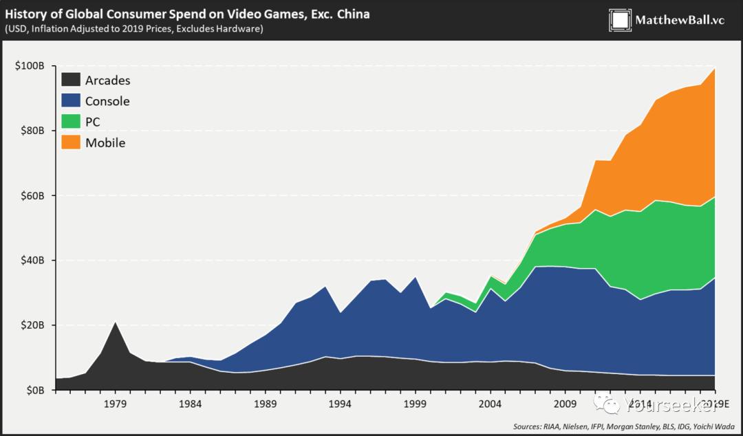 在线游戏最初出现在 1990 年代后期的 PC 上,2002 年 Xbox Live、2003 年 Steam 兴起之后,在线游戏市场陡然火热起来。尤其是到了 2010 年代中期,用户规模最大且最赚钱的游戏,始终都是在线游戏。