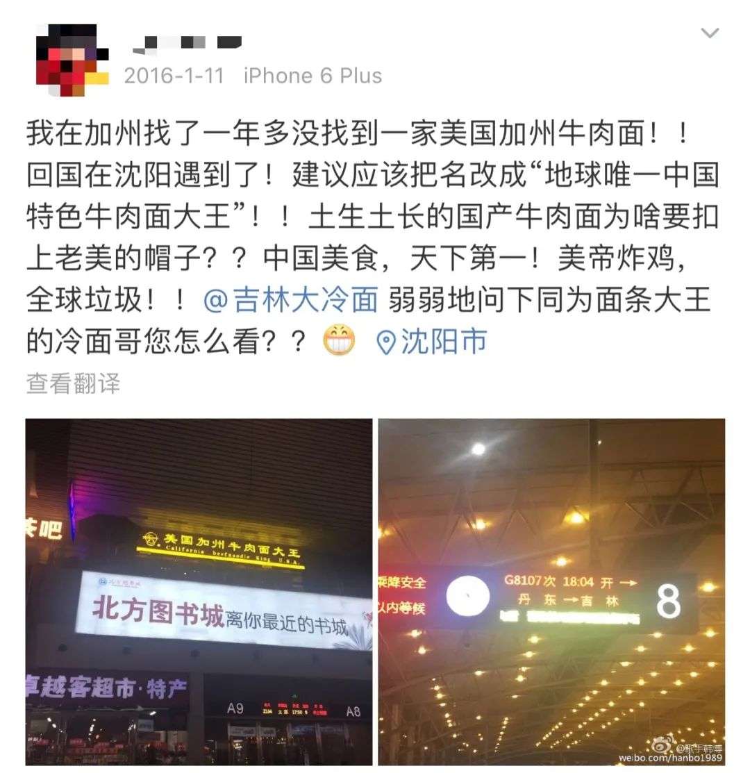 “我在加州找了一年多没找到一家美国加州牛肉面大王,回国在沈阳火车站遇到了,应该把名改成地球唯一中国特色牛肉面大王。”