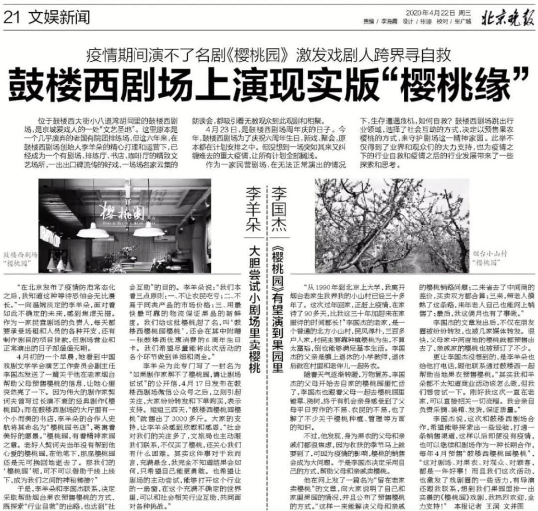 北京鼓楼西剧场创始人李羊朵表示:"其实早在2019年,鼓楼西剧场就曾策划尝试线上衍生品,但真正把这一想法向前推动,并最终落地,的确是疫情。"剧场在疫情期间因为卖樱桃引发了不小的关注,现在已经开始成立鼓楼西的商务公司,着手组建涉及文化产品、日常好物的产品线。