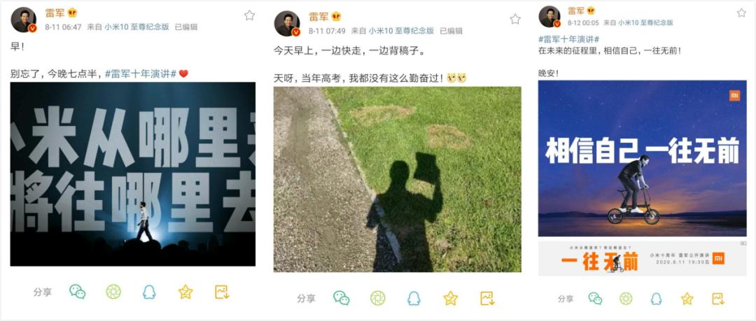 这十年中微博成长为日活跃用户破两亿的中国最大社交媒体平台,而雷军也成为拥有2299万粉丝的顶级KOL。甚至带动常程、林斌、卢韦冰等人都把微博作为了给自己产品打call的阵地。