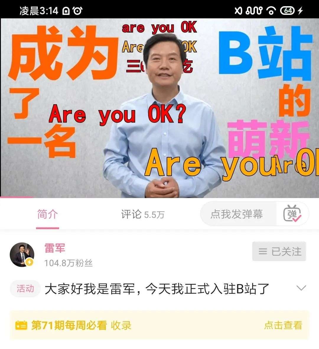 97家媒体联合直播,无论你在哪里都能看见雷军骑着自行车的海报。B站也是直播平台之一,在雷军直播过程中R U OK?、爷青回、666、小米牛逼、雷军猛男等弹幕刷屏不断。