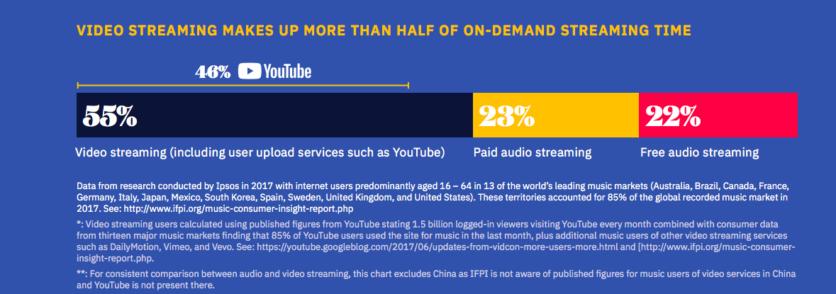 注:音乐流媒体在YouTube上的播放量占据总播放量的大半江山(来源:MusicBusiness Worldwide)