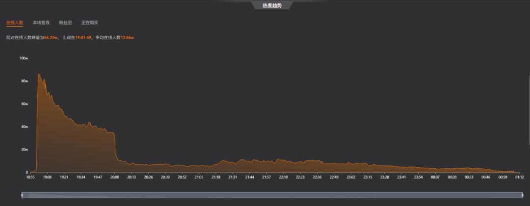 整场直播同时在线人数峰值为86.22万,出现在刚开播时,此后数据逐渐下降,在直播一个小时后,趋于平稳,平均在线人数13.86万。