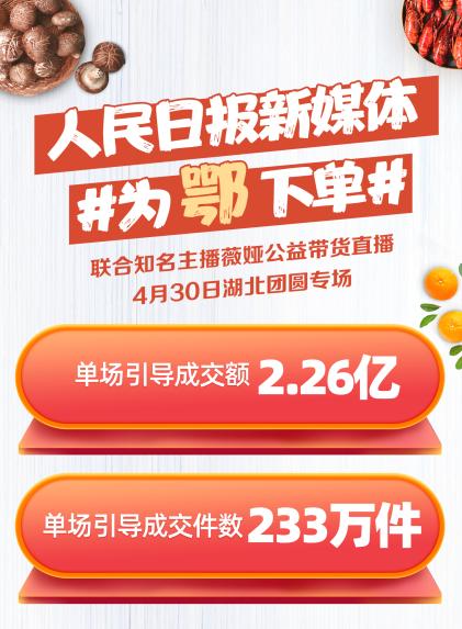 4月底,人民日报曾携手淘宝头部主播薇娅推出“湖北冲鸭”公益直播,单场引导成交额超过2亿元,鸭脖、鸭掌等商品一上架均被秒光。