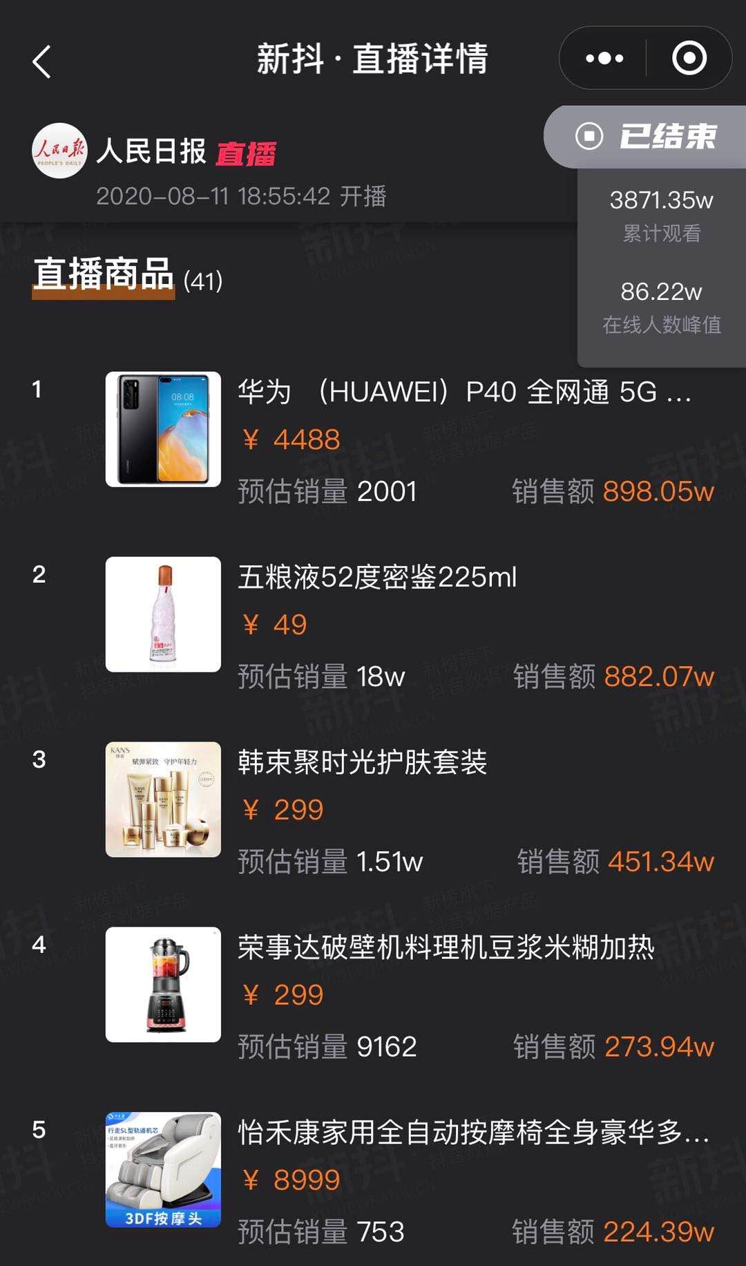 单场直播数据:41款产品,华为五粮液承包最高销售额