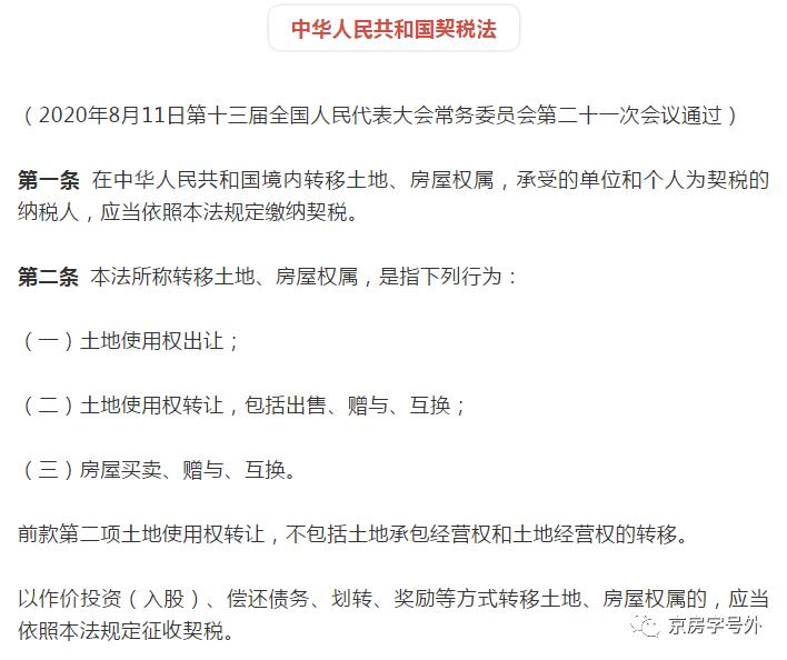 各位粉丝:昨天到今天,【京房字】的专家不断的被问到一件事,就是买房的契税是不是要上调了?原因是这样的。昨天一则重要的消息,就是8月11日十三届全国人大常委会第二十一次会议闭幕,契税法经表决通过,将于2021年9月1日起施行。