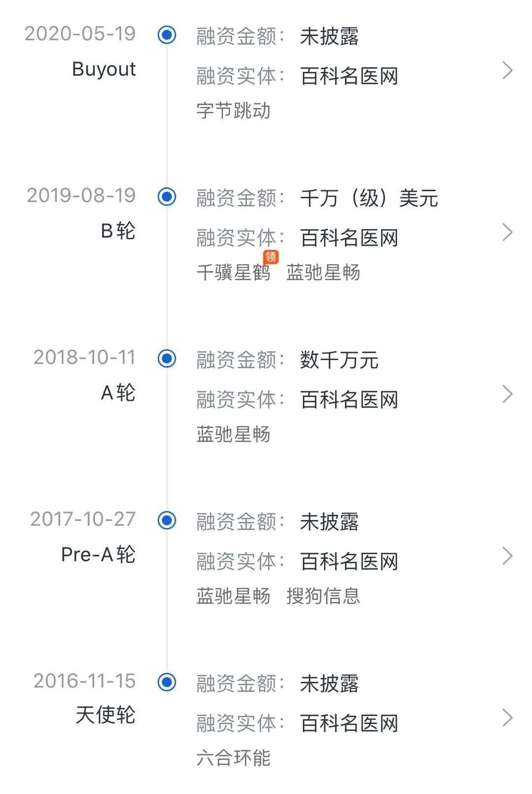 根据CVSource投中数据显示,被头条收购前,百科名医网已完成四轮融资,包括2019年8月千骥星鹤领投、蓝驰创投跟投的千万美元级B轮融资,以及2018年10月蓝驰创投领投,搜狗参投的数千万元A轮融资。
