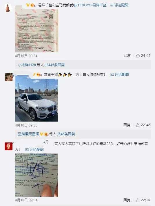 总是和他一起拿来作比较的易烊千玺,在4月份官宣为宝马新生代代言人后,宝马官博也在短时间内收获了大量买车晒单。
